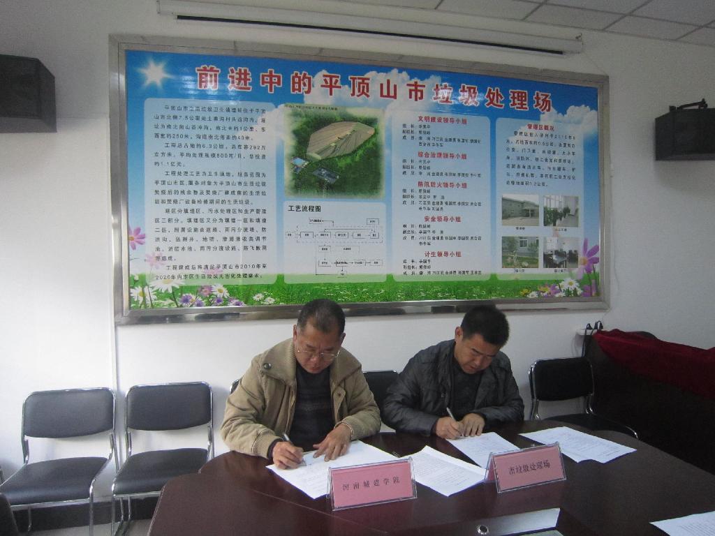 签字仪式上,环境与市政工程系主任郭一飞教授与平顶山垃圾处理场场长熊俊岭共同在合作协议书上签字。出席本次签约仪式的还有环境与市政工程系副主任田长勋、副书记焦学然、安全工程教研室主任刘章现。平顶山市城市管理处副书记、副主任陈始伟,平顶山市垃圾处理场书记辛国平及全体员工也共同出席和见证了本次仪式。