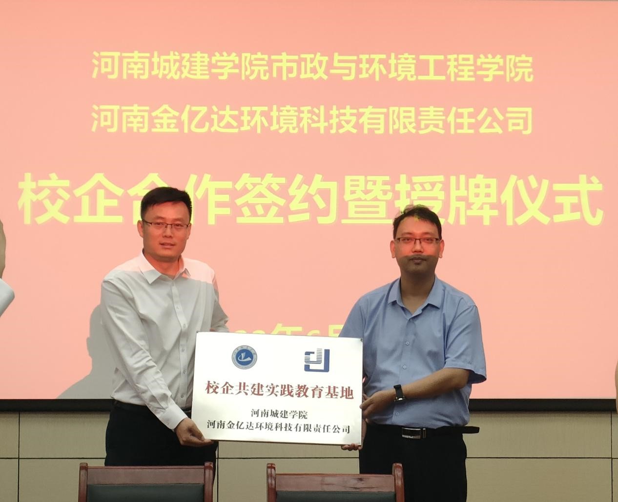 6月15日上午,公司与河南金亿达环境科技有限责任公司校企合作签约仪式在公司会议室举行。河南金亿达环境科技有限责任公司董事长乔晓磊、总经理乔晓广、技术总监史彦明、副总经理张肃冶、办公室主任王运杰以及公司经理朱新锋、副经理吴俊峰、刘彪出席了签约仪式,给排水科学与工程系、环境工程系、城镇先进环保技术河南省工程实验室、科研办等相关负责人参加会议。会议由刘彪主持。