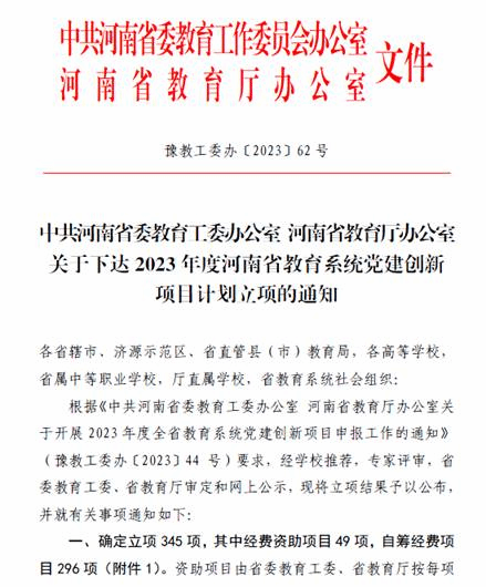 近日,河南省委教育工委、河南省教育厅下发了《关于下达2023年度河南省教育系统党建创新项目计划立项的通知》,公司党委书记曹恒慧主持的《应用型本科高校加强党风廉政建设研究》项目获批立项,这是公司首次获批省级党建研究项目。
