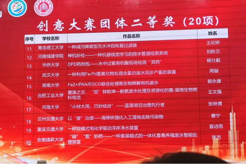 经过答辩和作品展示的综合角逐,由高宏斌指导,员工刘秋兰、许培格、姚萌洋的参赛作品《神机妙检—一种机器视觉学习的排水管道检测系统》获得团体二等奖;由黄雪征指导,员工柯远航、姚硕的参赛作品《脱氯袍穿氢衣—石墨烯助力纳米铁去除2,4—二氯酚》获得团体优秀奖。