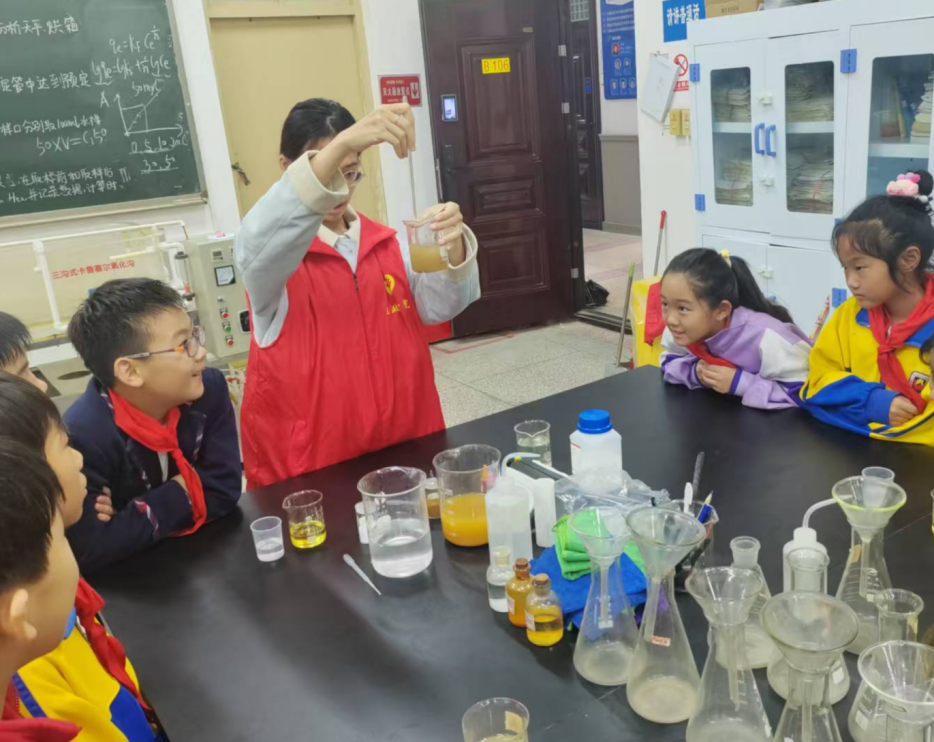 实验活动环节,志愿者以“化学花园”实验为引,指导孩子们观察化学试剂在碱性环境中“绽放”出色彩绚丽的“花园;开启探索之旅“污水变形记”实验里,孩子们见证模拟污水加混凝剂后变清的过程,读懂污水净化原理;“魔法火山秀”通过酸碱反应形成的“岩浆”喷涌奇观,打造沉浸式科学体验,直观的实验现象不仅揭开化学反应面纱,更点燃孩子们对微观世界的好奇与探索欲。