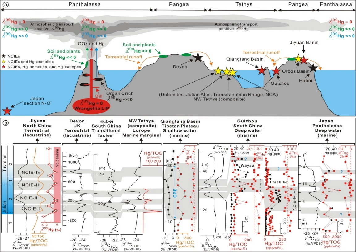 亮点三:全球不同纬度和地区几乎同步出现的碳同位素负偏移、Hg富集异常(Hg/TOC峰值)和接近于0值的Hg同位素证据证实兰格利亚大火成岩省的存在。