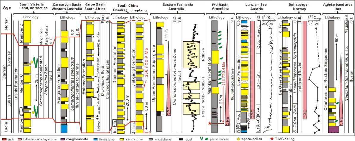 图3卡尼阶或者卡尼洪泛事件期间从极地到赤道地区的地层、沉积环境、植物大化石、孢粉化石和碳同位素组成