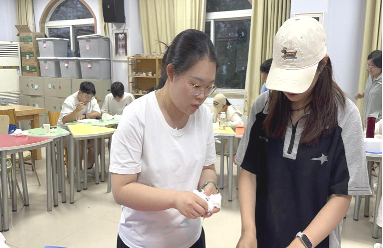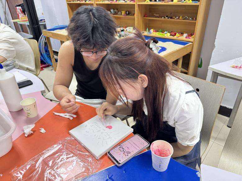 活动现场,参与者们围坐一起,沉浸在创作的乐趣中。在“共生·共融——指尖的温度,在纤维褶皱里生长初春”纸浆画活动中,参与者通过镊子或牙签,将纸浆小心翼翼的铺在画布上,塑造出各种形状和图案,每一次的按压和塑造都是参与者们在表达内心深处的情感,更是一种将内心积极情绪具象化的方式;在“顶上生花,愈见自己”涂绘草帽活动,同学们用铅笔绘制线稿,用马克笔、水彩颜料填图绘画属于自己的色彩帽子,帽子的各式各样、色彩斑斓也表达着员工心中的色彩构思与心理释放;在“凝胶成画,扇启清心”滴胶水扇活动中,同学们专注当下,忘却外界纷扰,将积压的情绪融入创作,达到舒缓压力、放松身心的效果。