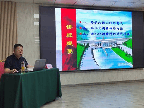 在理论教学环节,参训教师聆听了南阳师范公司司宁达老师《南水北调精神解读》专题报告,诠释了南水北调工程是国家科学统筹协调、库区移民舍家为国、移民征迁干部牺牲奉献、工程建设者和管理者创新求精的伟大产物以及“大国统筹、人民至上、创新求精、奉献担当”的南水北调精神。
