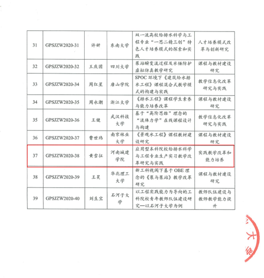 近日,教育部给排水科学与工程教指委组织专家对2020年度获批的40项教学改革项目进行了评审,公司beats365唯一官方网站黄雪征老师主持承担的教学改革研究项目“应用型本科院校给排水科学与工程专业生产实习教学改革研究与实践”(项目编号:GPSJZW2020-38)顺利通过结题验收。这是公司首次获批教育部给排水科学与工程教指委项目,同期获批的还包括清华大学、华中科技大学、东南大学、浙江大学、四川大学等高校。
