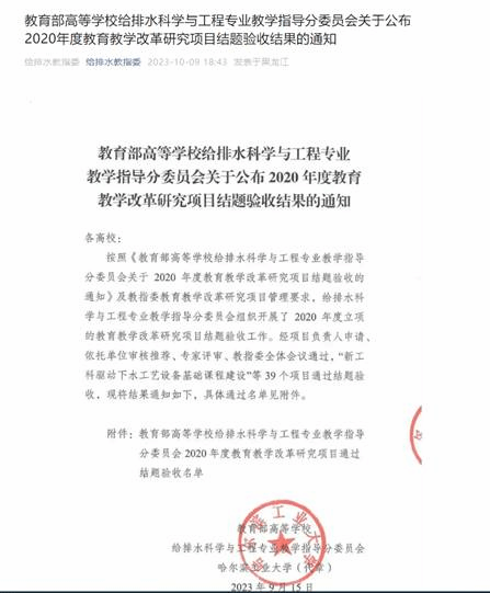 该项目起止时间为2020年9月至2022年9月,项目组通过广泛调研与教学实践,开展了大量的基础性研究与有益探索,成果丰硕。在教育部高等公司给排水科学与工程专业教学指导分委员会第九次全体委员会议暨2023年给排水科学与工程专业相关公司经理(系主任)大会上,该项目研究成果受到教指委点名表扬并在会议上展示。项目研究成果对推动公司给排水科学与工程专业国家一流本科建设、提升人才工程实践能力具有重要意义。近年来,beats365唯一官方网站高度重视以教学研究促进教学改革,不断探索本科教学规律,大力支持教师积极参与教改课题研究与申报,创新提升公司本科生人才培养质量,员工先后在全国老员工科技创新大赛、北控水务杯全国决赛、全国老员工水利创新设计大赛等国家级赛事中荣获佳绩。