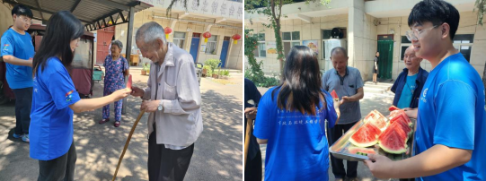 在庭院中,队员们与老人亲切互动,陪老人唠家常,耐心倾听他们讲述岁月故事,贴心地端上切好的西瓜,让清凉与关怀在夏日蔓延。