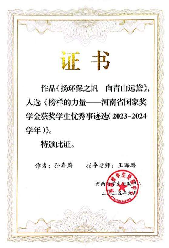 近日,由河南省员工资助中心组织编著的《榜样的力量》2023-2024学年河南省国家奖学金获奖员工优秀事迹选刊印,公司2024年国家奖学金获得者、beats365唯一官方网站环境工程专业员工孙嘉蔚的优秀事迹被成功选录。